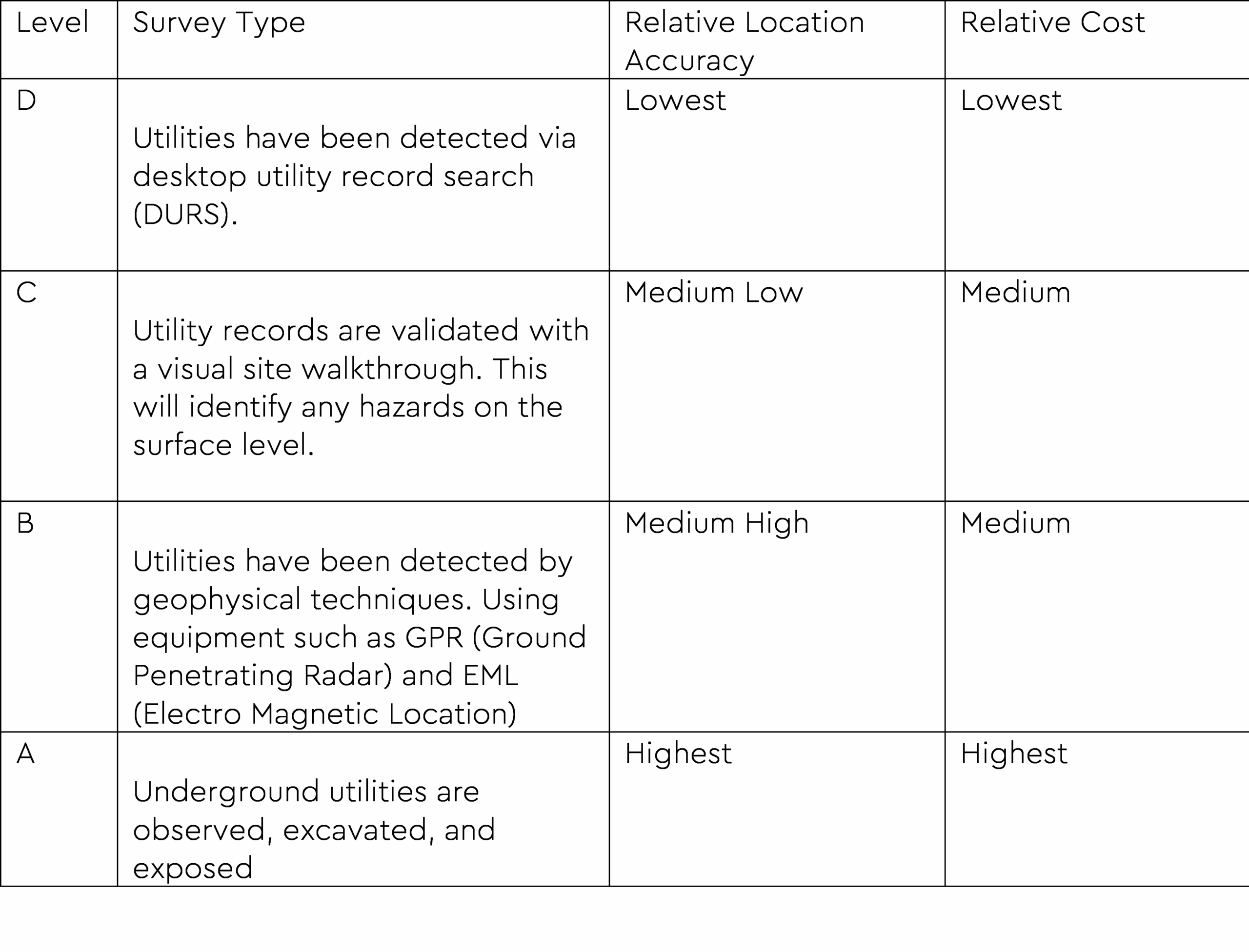 There are four levels of underground detection surveys. Each one focuses on different degrees of location certainty that are agreed upon between Powers surveyors and their clients. The different levels include: