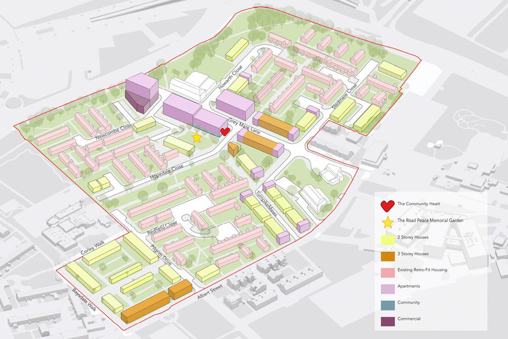 Grey Mare Lane is part of One Manchester Housing Association. It is a large urban redevelopment scheme to the south of Manchester City’s football ground, the Etihad Stadium. The brownfield site is undergoing a regeneration and redevelopment, to create a range of new affordable housing. Properties and tenants are already in residence too, as the district is a well-established estate. Its redevelopment is part of the Eastlands Regeneration Framework, which is a schedule of work agreed by Manchester City Council. This plan sets out the vision for the wider area and the proposed investment in facilities, new businesses and work opportunities. It is being coordinated by Manchester City Council, One Manchester, Manchester Life and other partners. The Eastlands Regeneration Framework has identified the area around Grey Mare Lane as one of its key focus areas.